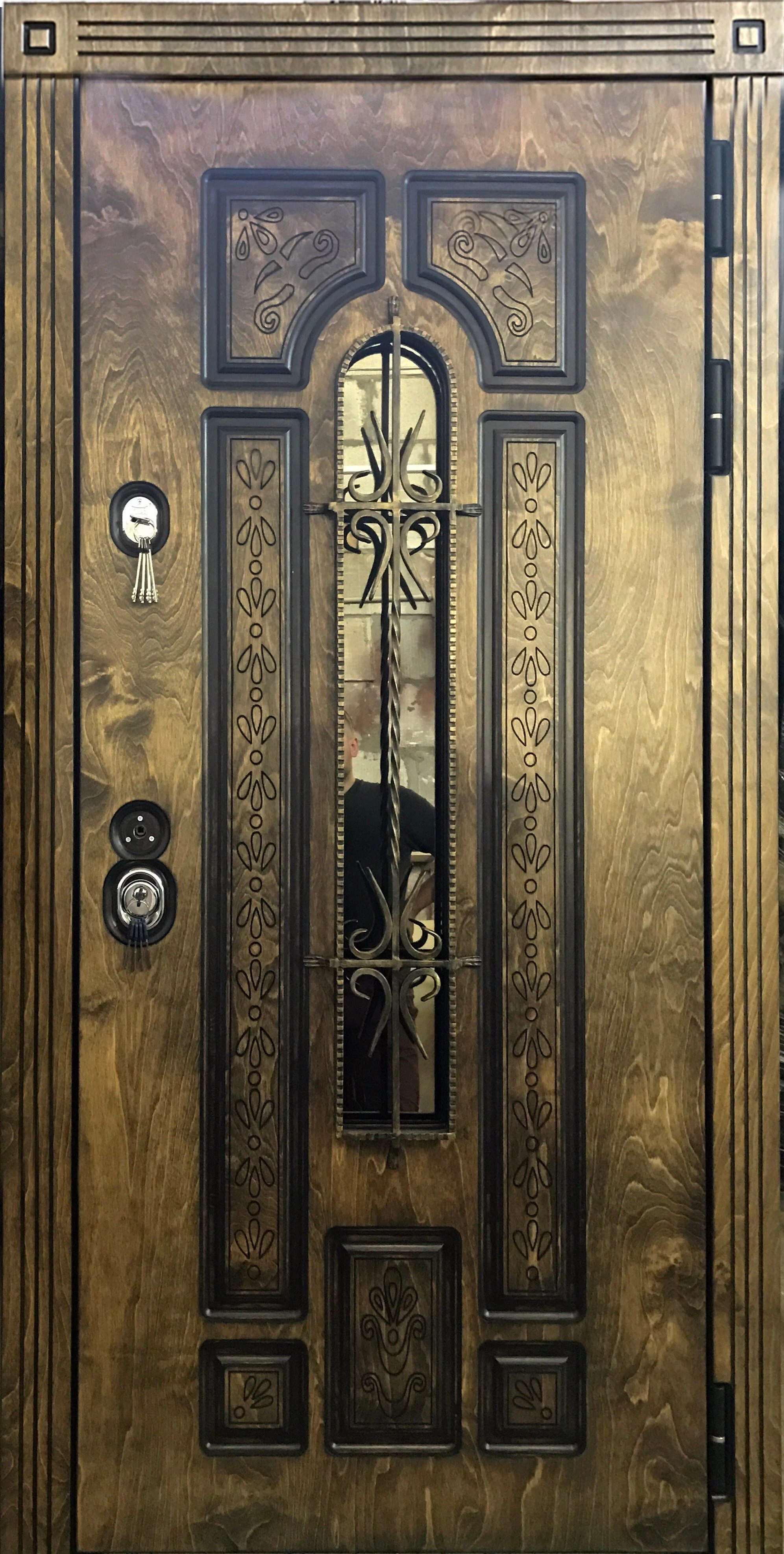 Металлическую дверь из корабельной фанеры можно декорировать ковкой и стеклом, витражом, зеркальными вставками. При установки такой двери в коттедж, стоит рассмотреть вариант изготовления двери с терморазрывом. Это позволит не делать в доме холодный тамбур, но при этом сохранить в доме тепло.