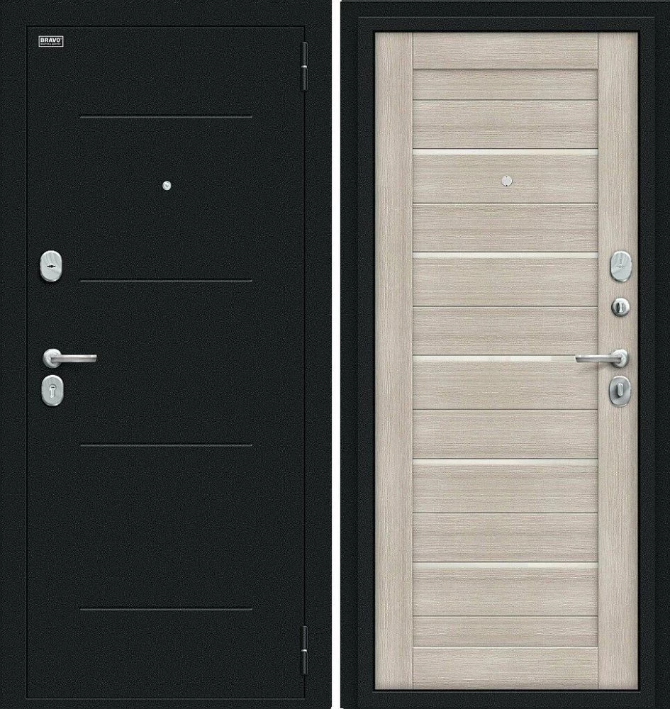 Надежная входная Браво Техно Kale Букле черное/Cappuccino Veralinga премиум класса по цене 34 777 руб. Большая толщина стали защитит от проникновения в ваш дом, квартиру или коттедж. Используется очень качественная фурнитура: замки, цилиндры, ручки, защелки. Покрытие и отделка двери изготовлено под внимательным контролем производителя. Дверь имеет долгий срок службы и гарантию.